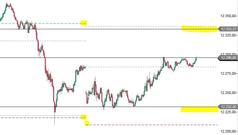 der Dax hat sich von der ersten Korrektur wieder etwas erholt und schwankt um die 12.300 Punkte. Der Bereich unter 12.275 bis 12.220 ist eher als schwach anzusehen. Über 12.305 bis 12.340 eher stärker.