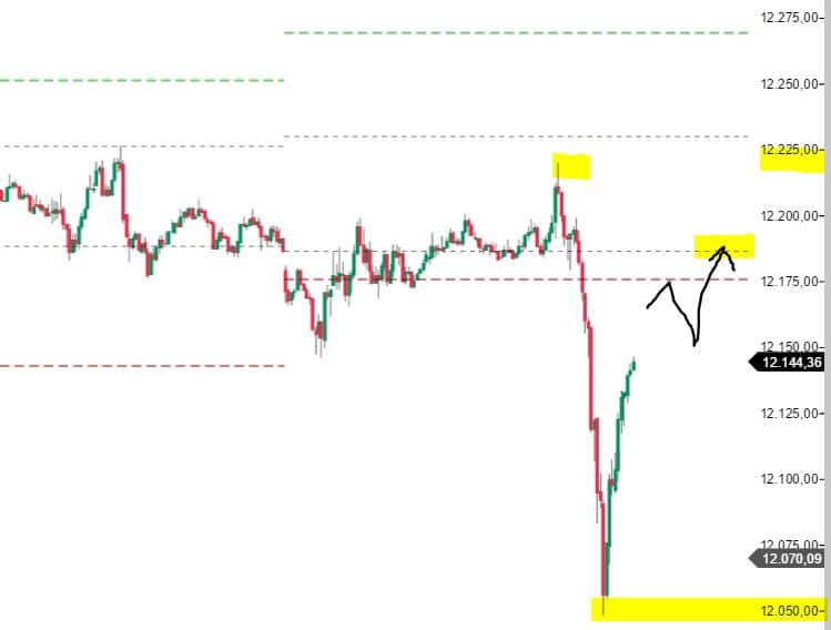 Das könnte aber der Startschuss für einen weiteren Anlauf auf das Alltime-High gewesen sein. Schließlich konnten jetzt wieder die Anteile von den “schwachen” in die “starken” Hände wechseln. Institutionelle Anleger die zwischen 12.050 und 12.100 zugegriffen haben werden mit jedem neuen Hoch Ihre Positionen weiter ausbauen.