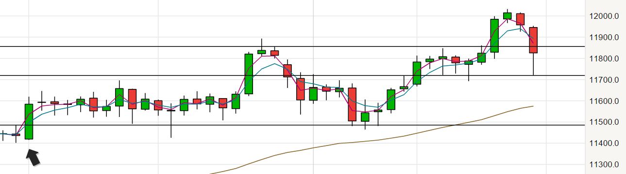 Zum Jahresbeginn stieg der Dax über die Marke von 11.485 Punkten. Während alle auf eine Konsolidierung warteten ging der Trend sehr zügig weiter. Die erste Impulsbewegung aus der Seitwärtsphase (Aug bis Dez) von ca. 10.400 auf 11.400 Punkte mündete gleich in die nächste Bewegung ohne groß zu korrigieren (s. Pfeil). Die Marke bei 11.485 sollte mehrfach verteidigt werden, bevor Mitte Februar der Angriff auf die 12.000 Punkte erfolgte.