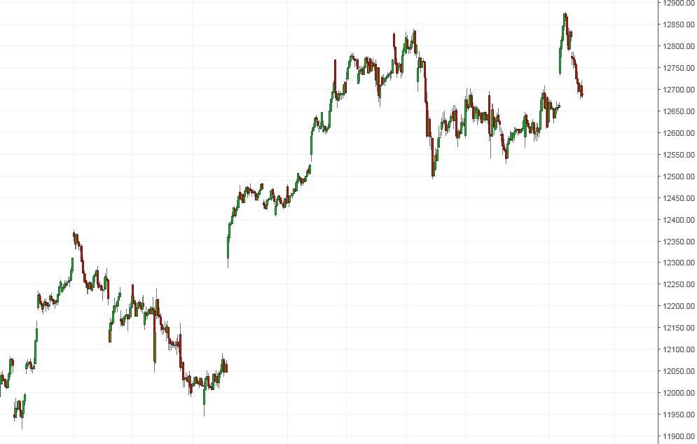 der Dax kennt seit Wochen und Monaten nur eine Richtung: nach oben. Nach der letzten Korrektur auf 12.500 Punkte gingen viele davon aus, dass sich der Index jetzt in eine längere Korrektur verabschiedet (mindestens bis zum Gap-Close bei ca. 12.050). Allerdings überraschte der Sprung über die 12.700 viele Anleger und ein erneutes Gap zwang viele zu Positionsauflösungen oder erzeugten Neueinstiege, die den Kurs Richtung 12.900 Punkte trieben.